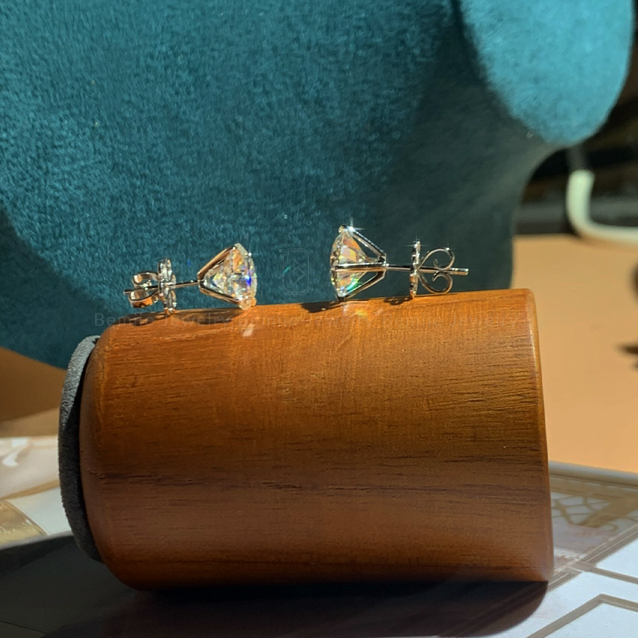 Thiết kế 4 chấu chắc chắn, ôm trọn viên chủ kim cương nhân tạo Moissanite, giác cắt tròn kiêu hãnh – điểm nhấn hoàn hảo, tinh túy của đôi bông tai.