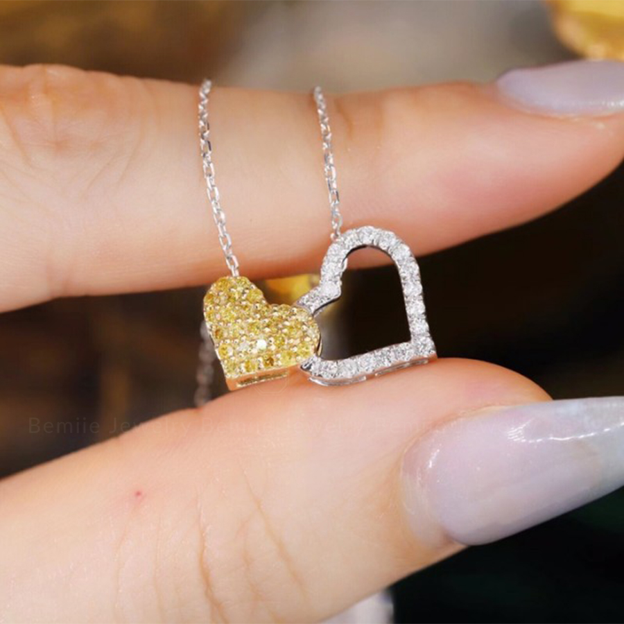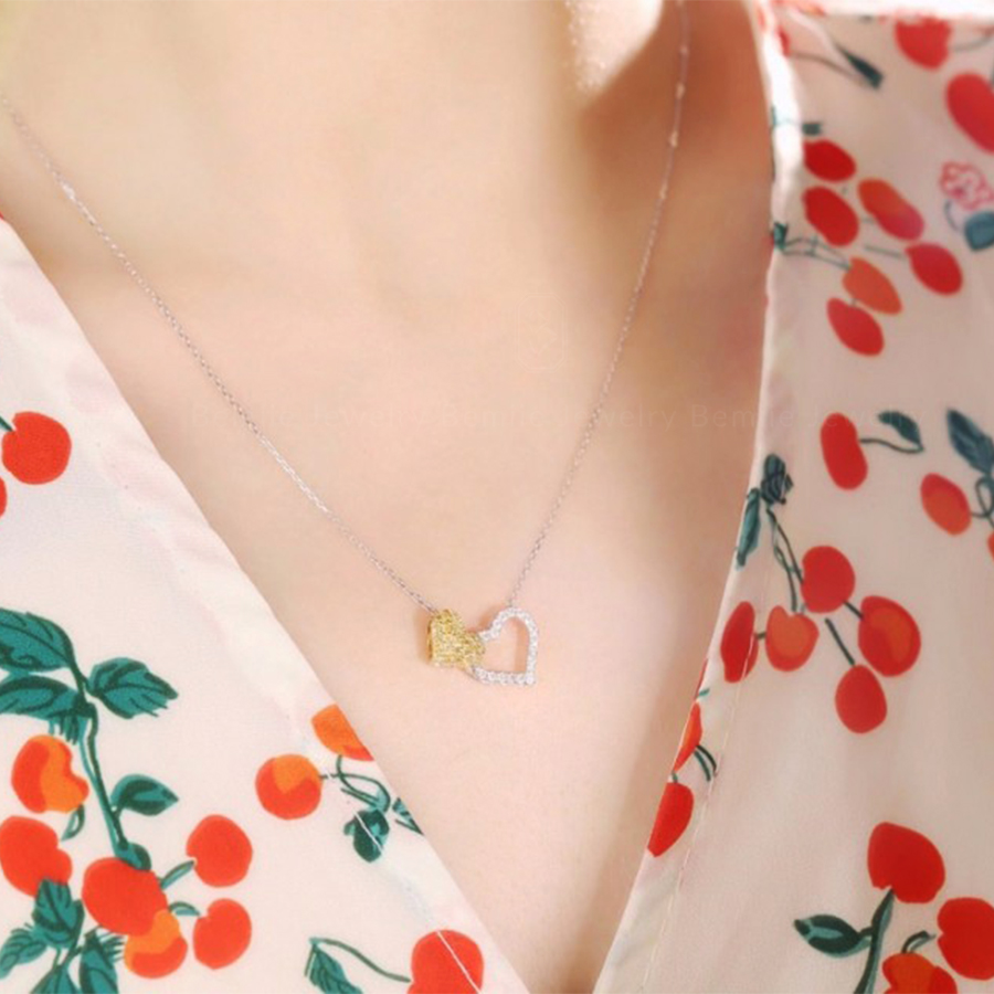 Dây Chuyền Kim Cương Tự Nhiên Hình Trái Tim 18K ngọt ngào được Bemiie thiết kế đan lồng vào nhau, biểu tượng cho tình yêu gắn kết bền chặt. Chế tác từ những viên kim cương tự nhiên, một trái tim được chạm trổ bằng kim cương tấm màu trắng tinh khôi, trái tim còn lại được nạm bằng kim cương tấm sắc vàng Fancy quyến rũ. Chất liệu vàng 18K bền bỉ kết hợp tạo nên một minh chứng cho tình yêu mãi mãi không chia lìa.