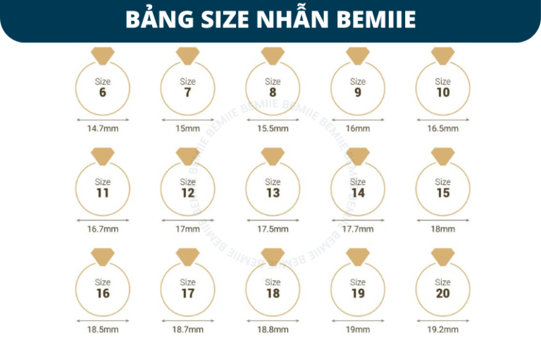 Size nhẫn nữ Bemiie Jewelry từ size 6 – 14. Size nhẫn nam Bemiie Jewelry từ size 14 – 20