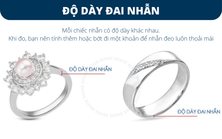 c. Chú ý độ dày của nhẫn:Độ dày của nhẫn ảnh hưởng tới size của mỗi người. Đối với các loại nhẫn vàng, nhẫn bạc, nhẫn cưới hay nhẫn thiết kế riêng của Bemiie Jewelry sẽ có độ dày khác nhau. Bởi vậy, khi tiến hành đo, bạn cần chú ý điều chỉnh thêm hoặc bớt đi một chút kích thước đẻ đeo nhẫn luôn thoải mái nhất.