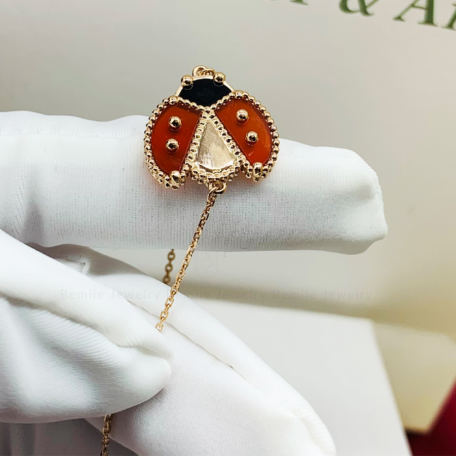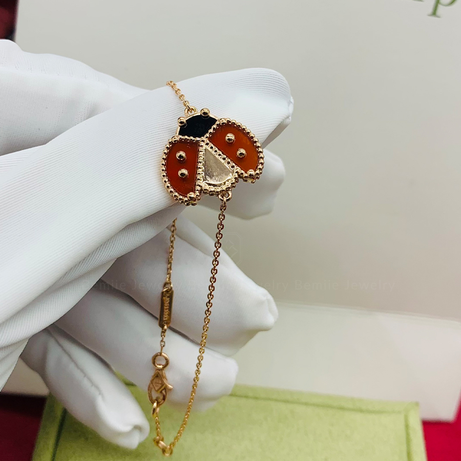 Lắc Tay Lucky Spring Ladybug Mở Cánh 18K được khắc họa lại mùa xuân tràn ngập may mắn cùng thiên nhiên đất trời với Ladybug – chú bọ cánh cứng ngọt ngào được nạm đá Carelian đỏ. Họa tiết hạt vàng Au750 (18K) quen thuộc trong các bộ sưu tập, khiến chiếc lắc tay Lucky Spring thêm cuốn hút hơn bao giờ hết.