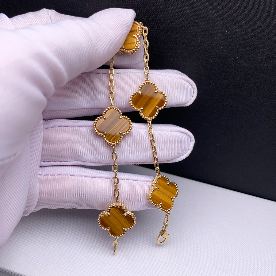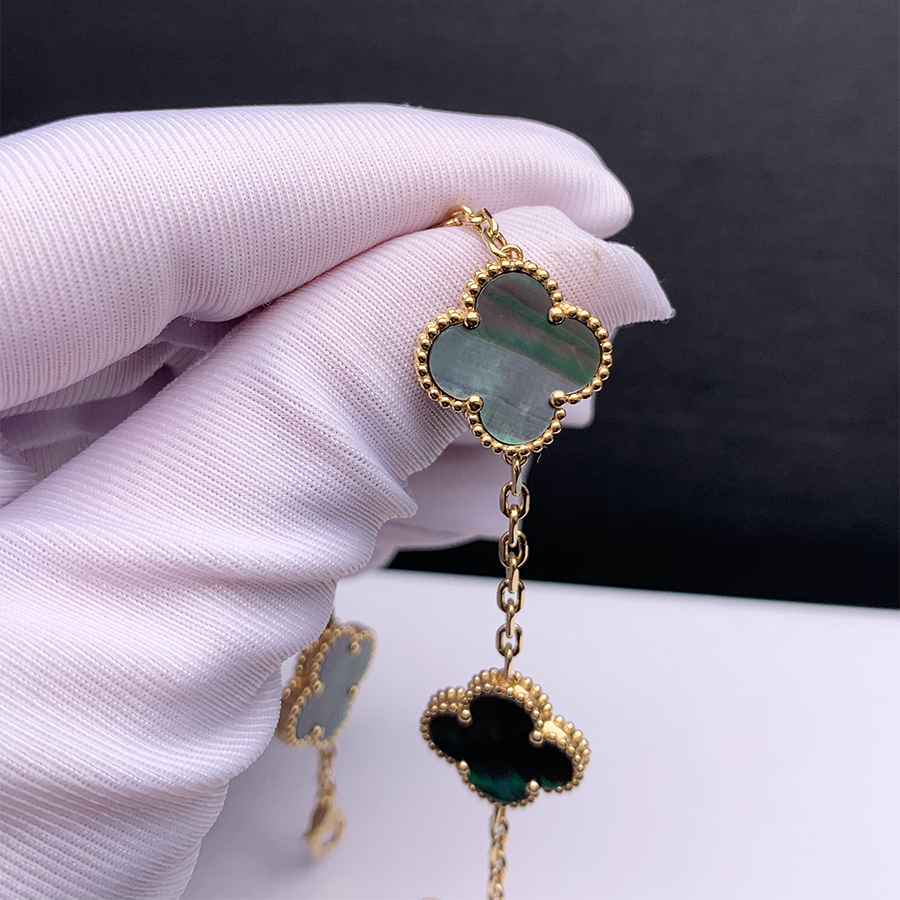 Lắc Tay Vintage Alhambra 5 Motifs 15mm 18K là phiên bản standard với kích cỡ Small Model theo tiêu chuẩn của thương hiệu, được lấy cảm hứng từ chiếc lá cỏ bốn lá – biểu tượng may mắn này được trang trí bằng viền hạt vàng Au750 (18K), mang âm hưởng của tình yêu lãng mạn và vẻ đẹp thiên nhiên bất tận tới gần chủ nhân hơn bao giờ hết. Chiếc lắc tay được nạm các loại đá quý khác nhau như: Malachite xanh khổng tước, Mother of Pearl trắng xà cừ, Onyx đen huyền bí, Tiger Eye hổ phách vàng,…