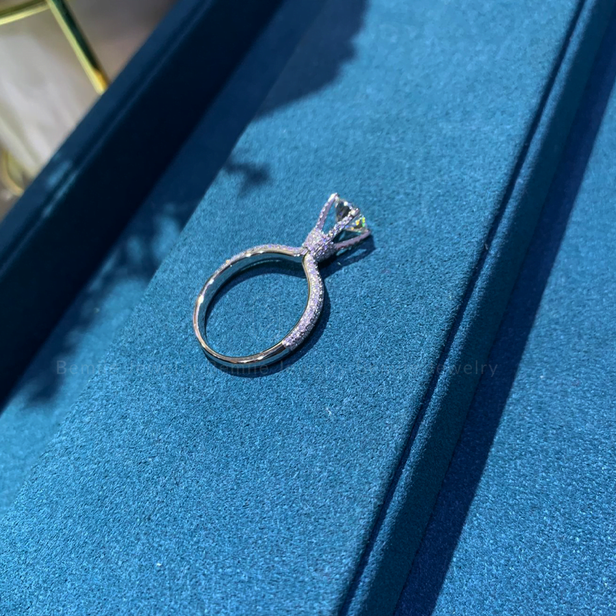 Chiếc Nhẫn Cầu Hôn Dreamy Hidden Halo được Bemiie Jewelry thiết kế với chấu cao kiêu kỳ, sang trọng, đai nhẫn và toàn bộ phần chấu được đính kim cương tấm lấp lánh nổi bật, tôn lên vẻ đẹp rạng ngời của viên chủ.