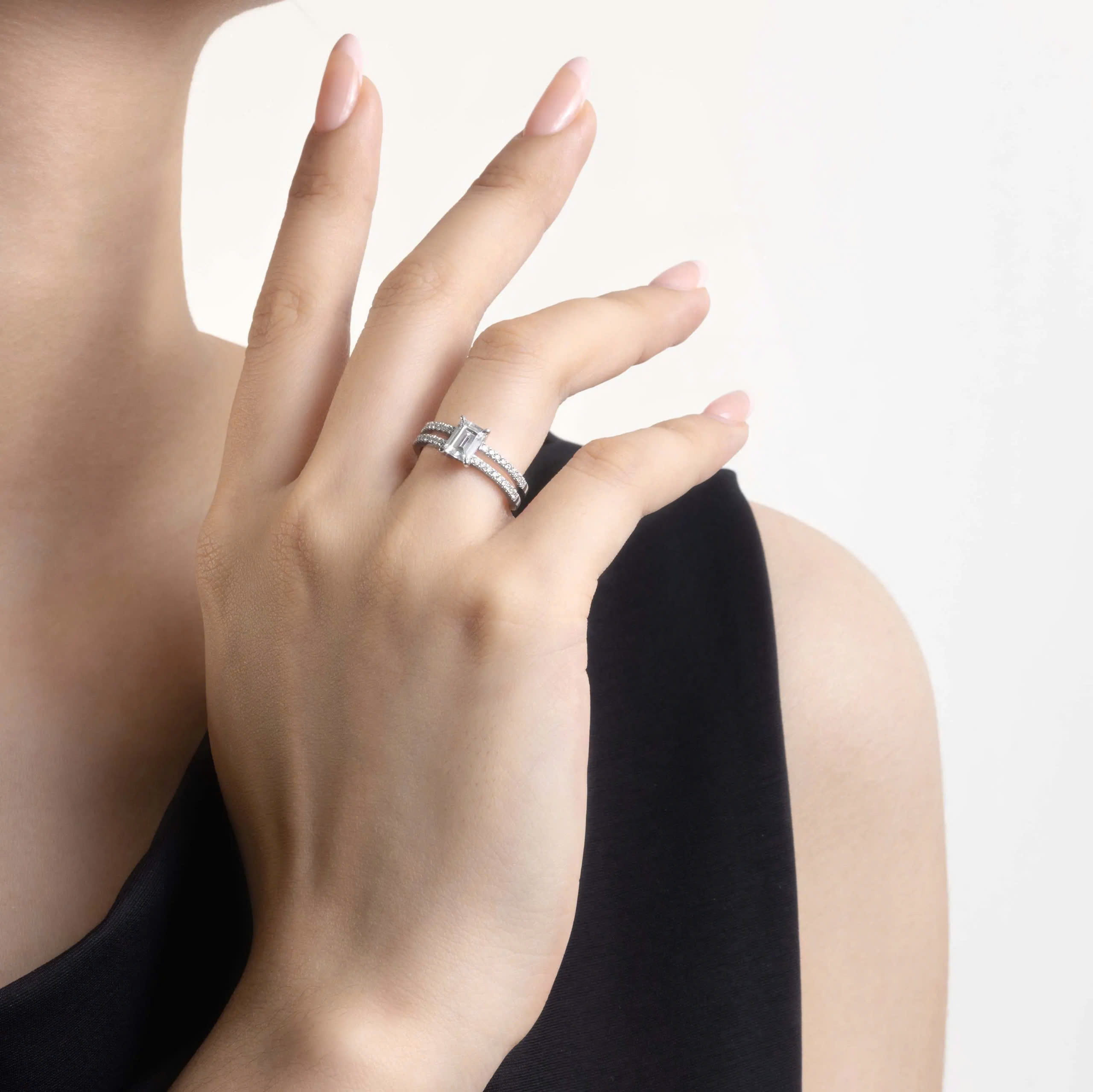 Chiếc nhẫn cầu hôn Emerald Dual Embrace mang vẻ đẹp phá cách với khuôn mẫu thông thường, thiết kế 2 đai nhẫn đặc biệt mang phong cách hiện đại, trẻ trung, đính viên đá tấm nhỏ xinh, tạo nên sự lấp lánh tinh tế.