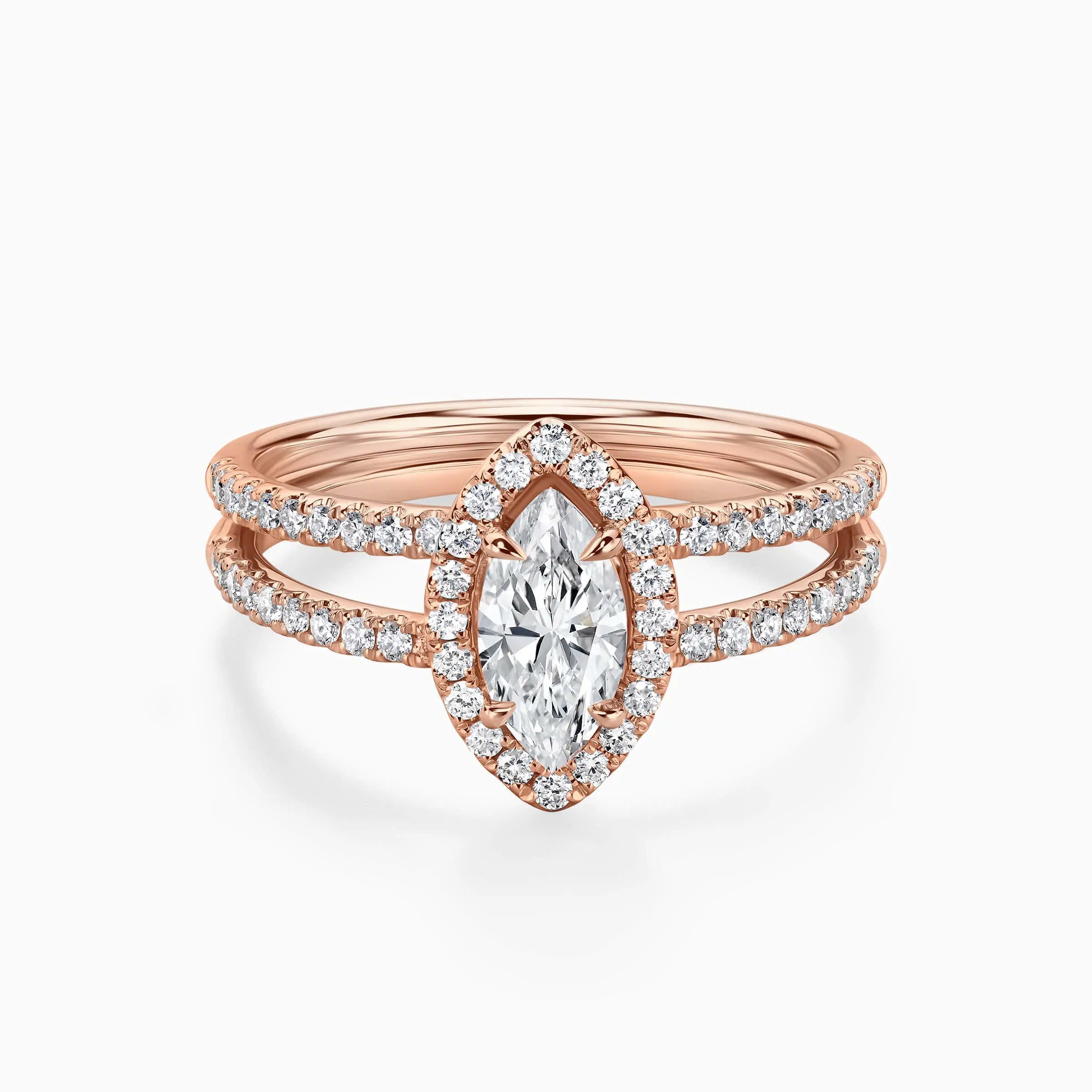 Chiếc nhẫn cầu hôn Marquise Dual Embrace là phiên bản đổi mới, đầy tính sáng tạo của phong cách Halo cổ điển. Vẫn giữ nguyên được vẻ đẹp tinh tế của kiểu nhẫn Halo, với ánh hào quang halo, tạo hiệu ứng lấp lánh xung quanh viên chủ, thiết kế đặc biệt với 2 đai nhẫn kết hợp, mang tới làn gió mới mẻ cho cô nàng yêu sự phá cách, hiện đại và trẻ trung.
