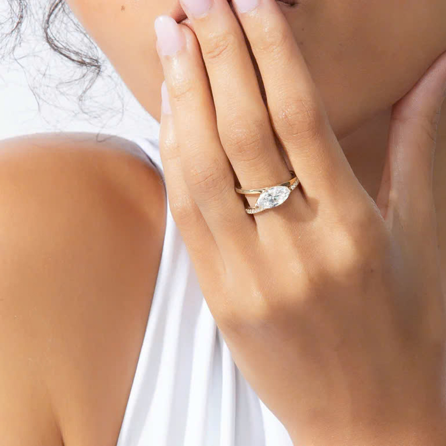 Nhẫn cầu hôn Venus Paved Solitaire Bezel Marquise với viên chủ Lab-Grown Diamond giác cắt Marquise được setup vị trí nằm ngang khác biệt, kết hợp đai nhẫn V-shape đan xéo, không cân xứng mang tới sự mới mẻ nhưng vẫn đậm chất hiện đại, trẻ trung và thanh lịch.