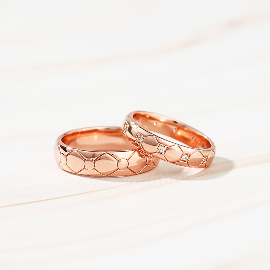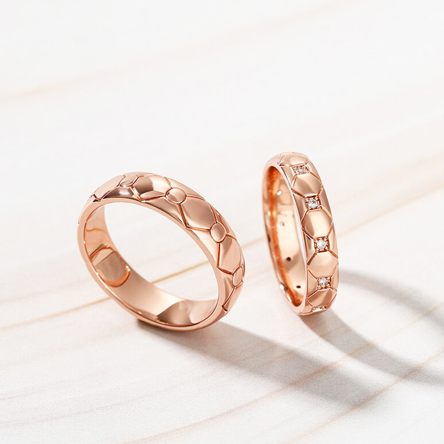 Cặp nhẫn cưới Geometric Design được Bemiie thiết kế khắc họa hình tròn và lục giác nối tiếp nhau trên dải nhẫn, tạo sự mới lạ và độc đáo. Với họa tiết hình học khô khan, Bemiie đã biến hóa và thổi hồn những vật thể vô tri để trở nên sống động và hiện đại hơn. Dải hình học nối tiếp nhau tượng trưng cho một tình yêu kết nối liên tục tạo một vòng tròn hoàn hảo.