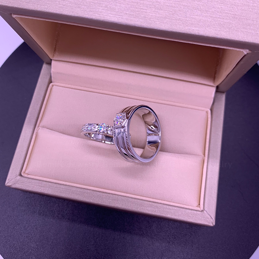 Chiếc nhẫn kim cương nam được cách điệu phần đai trên chất liệu vàng trắng 18K đẳng cấp tạo sự mạnh mẽ, đơn giản, phóng khoáng và sang trọng. Sự dịu dàng, thanh lịch được chú trọng vào từng đường nét thiết kế trên nhẫn nữ với viên chủ nhỏ xinh, không quên tạo ánh hào quang lấp lánh bằng kim cương tự nhiên tấm tại phần đai nhẫn giúp đôi bàn tay nàng thêm thanh mảnh, mềm mại hơn.
