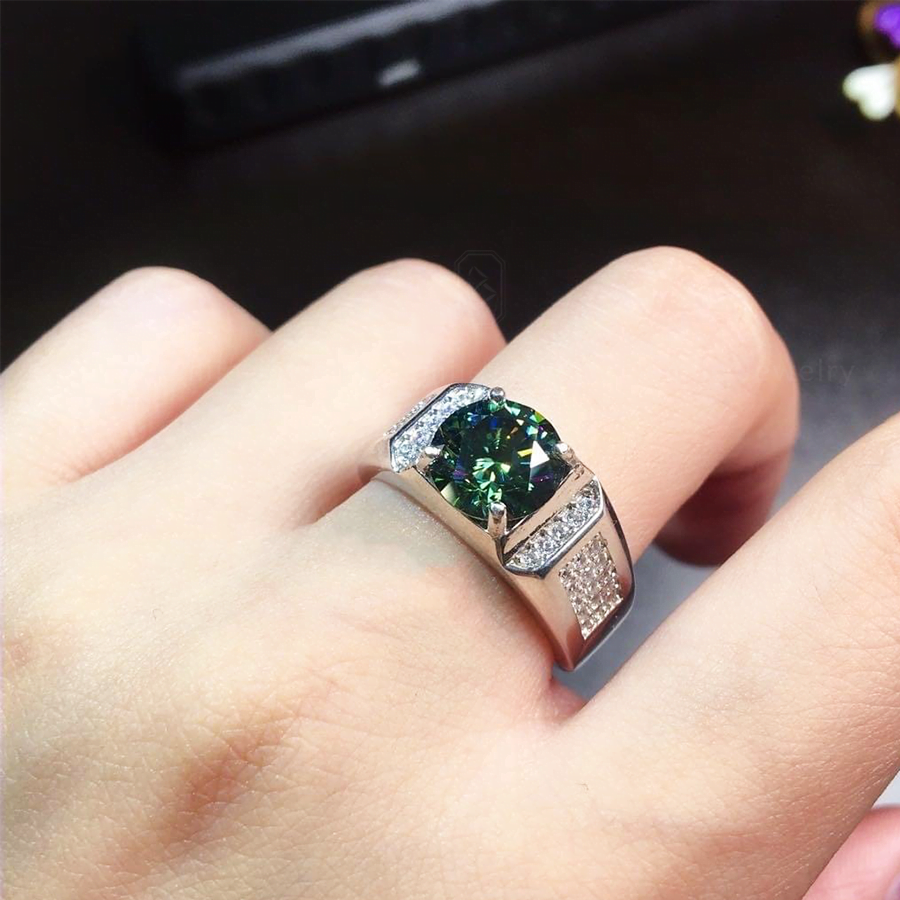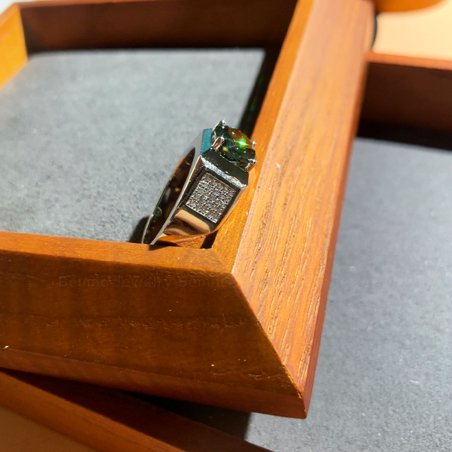 Nhẫn Nam Dark Green Classic tinh tế được Bemiie Jewelry thiết kế theo phong cách classic & basic, viên chủ nổi bật xanh cổ vịt quyền năng và chạm trổ viên Moissanite tấm tại đai nhẫn.