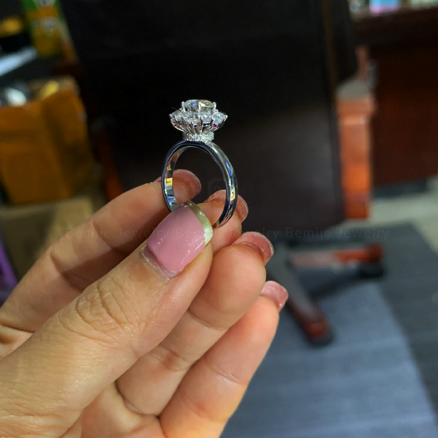 Chiếc nhẫn nữ Daisy Blossom Halo được Bemiie Jewelry thiết kế theo phong cách Halo cách điệu tinh tế khiến vẻ đẹp của viên chủ tròn 8H8A ( 8 trái tim, 8 mũi tên) sở hữu giác cắt siêu lý tưởng thêm sức quyến rũ.