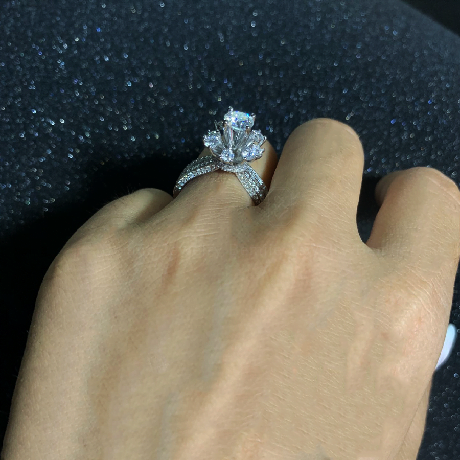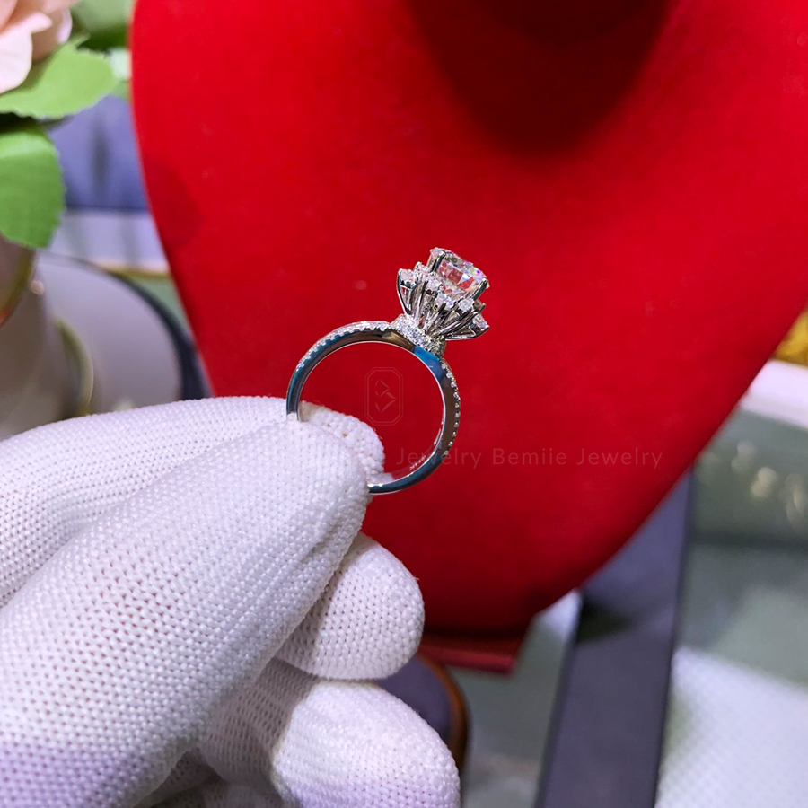Nhẫn Daisy Flower Premium sở hữu dáng nhẫn thanh cao với phần chấu cao kiêu kỳ, sự thu hút tập trung vào viên chủ kim cương Moissanite giác cắt tròn được sáng tạo là phần nhụy hoa tinh túy, xung quanh là cánh hoa được chạm trổ bằng những viên kim cương kích cỡ nhỏ xinh hơn tăng thêm phần lấp lánh, quyến rũ cho chiếc nhẫn.