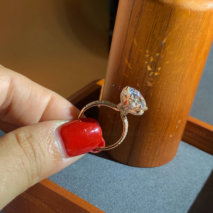 Bemiie Jewelry đã thổi hồn vào những viên Moissanite để tạo nên kiệt tác “Bông hoa kim cương” nở rộ trên tay của chủ nhân. Kết hợp cùng chất liệu vàng Rose Gold – sắc hồng quyến rũ, từng cánh hoa được trạm trổ bằng những viên Moissanite tấm lấp lánh, tôn trọn vẻ đẹp của viên kim cương chủ rực rỡ – tâm điểm của chiếc nhẫn. Nét quyến rũ, lôi cuốn không thể chối từ khi trên tay nàng phảng phất hương thơm từ bông hoa kim cương.