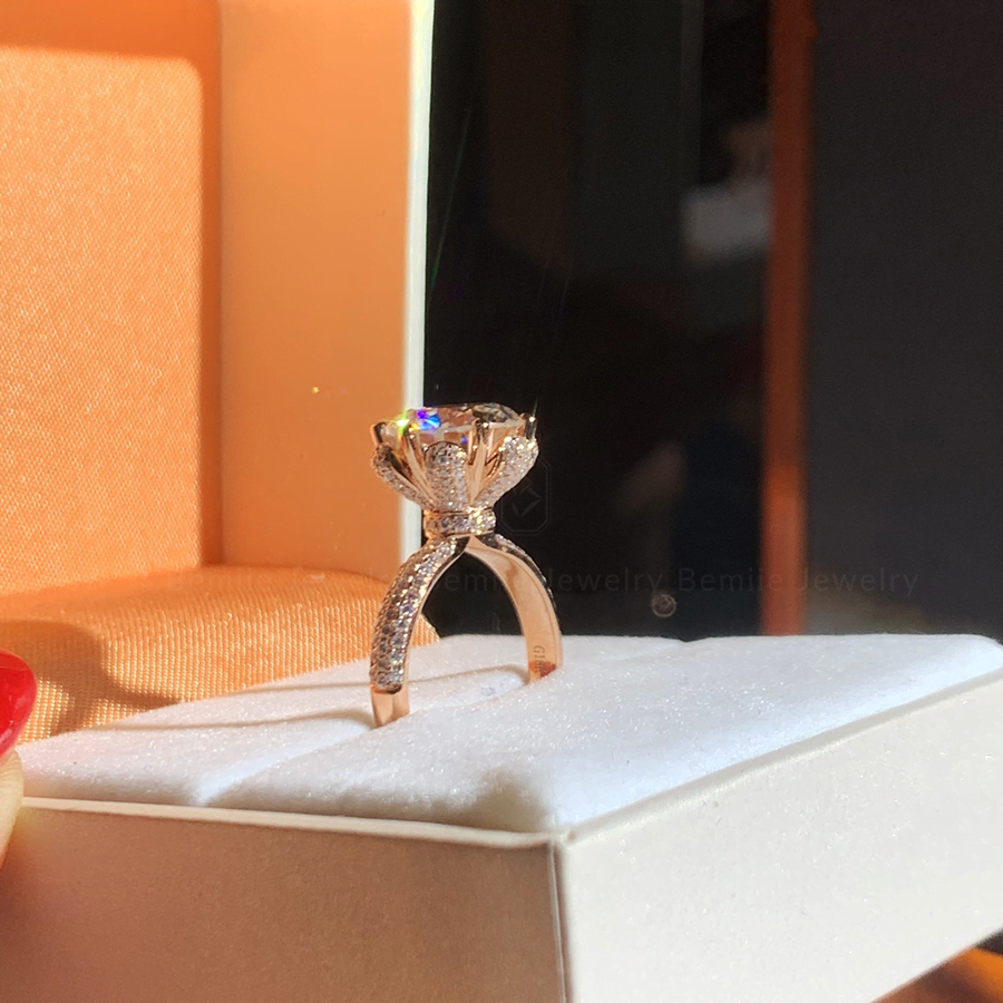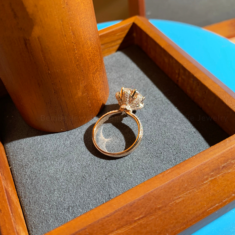 Bemiie Jewelry đã thổi hồn vào những viên Moissanite để tạo nên kiệt tác “Bông hoa kim cương” nở rộ trên tay của chủ nhân. Kết hợp cùng chất liệu vàng Rose Gold – sắc hồng quyến rũ, từng cánh hoa được trạm trổ bằng những viên Moissanite tấm lấp lánh, tôn trọn vẻ đẹp của viên kim cương chủ rực rỡ – tâm điểm của chiếc nhẫn. Nét quyến rũ, lôi cuốn không thể chối từ khi trên tay nàng phảng phất hương thơm từ bông hoa kim cương.