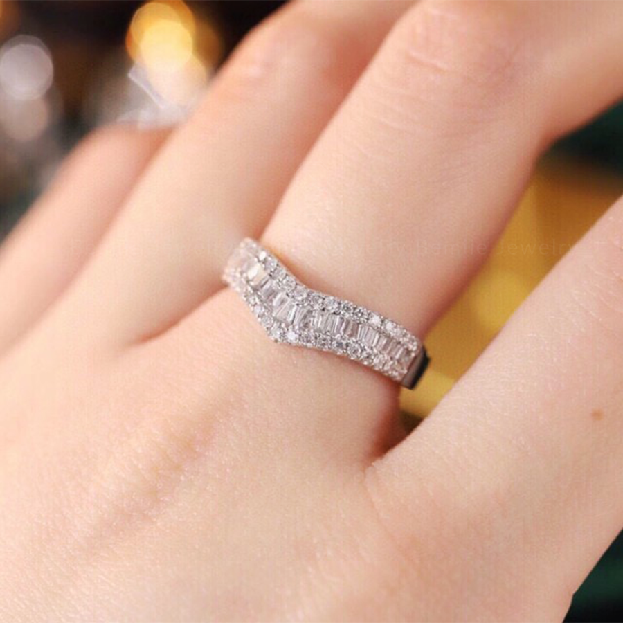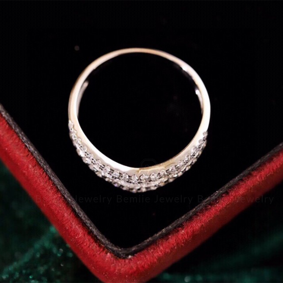 Sự kết hợp nhẹ nhàng, hài hòa nổi bật hàng kim cương Baguette với sự trợ lực lấp lánh từ 2 hàng kim cương tấm tròn được đính trên đai nhẫn, giúp tối giản các họa tiết rườm rà để dành riêng cho chủ nhân yêu thích sự đơn giản với phong cách “minimalism”.