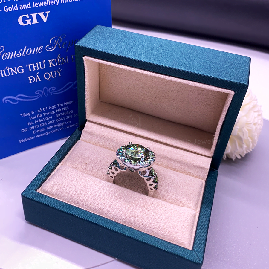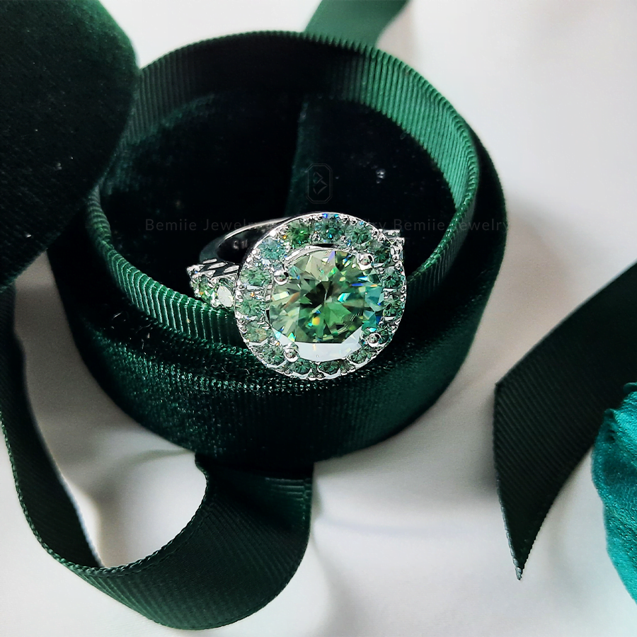 Nhẫn nữ Round Green Halo Royal phong cách Halo với viên chủ xanh lá độc đáo, lấp lánh sắc xanh khi Moissanite tấm được đính tại đai nhẫn tạo sự cộng hưởng đầy tinh tế.